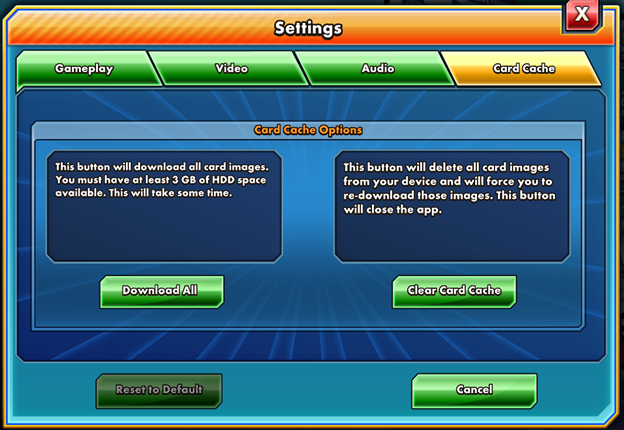 To avoid the need to load card images during gameplay, you can pre-load the card images via the Card Cache prior to playing in Versus Mode.