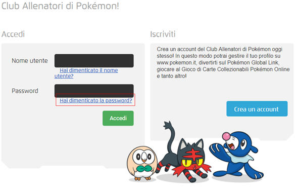 Dalla pagina di accesso al Club Allenatori di Pokémon, seleziona l’opzione Hai dimenticato la password?